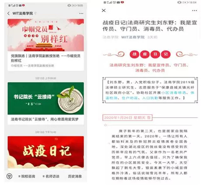 为更好彰显党员、群众抗击疫情的不凡壮举,弘扬校园正能量。学院党委利用“微媒体”,向全体党员宣传威尼斯官网师生抗疫先锋勇挑重担、迎难而上的感人事迹,弘扬社会正能量,鼓舞斗志,展现全国人民同舟共济的精神风貌,培养党员勇于担当奉献的精神,凝聚众志成城抗疫情的强大力量,全力打赢这场疫情防控阻击战。